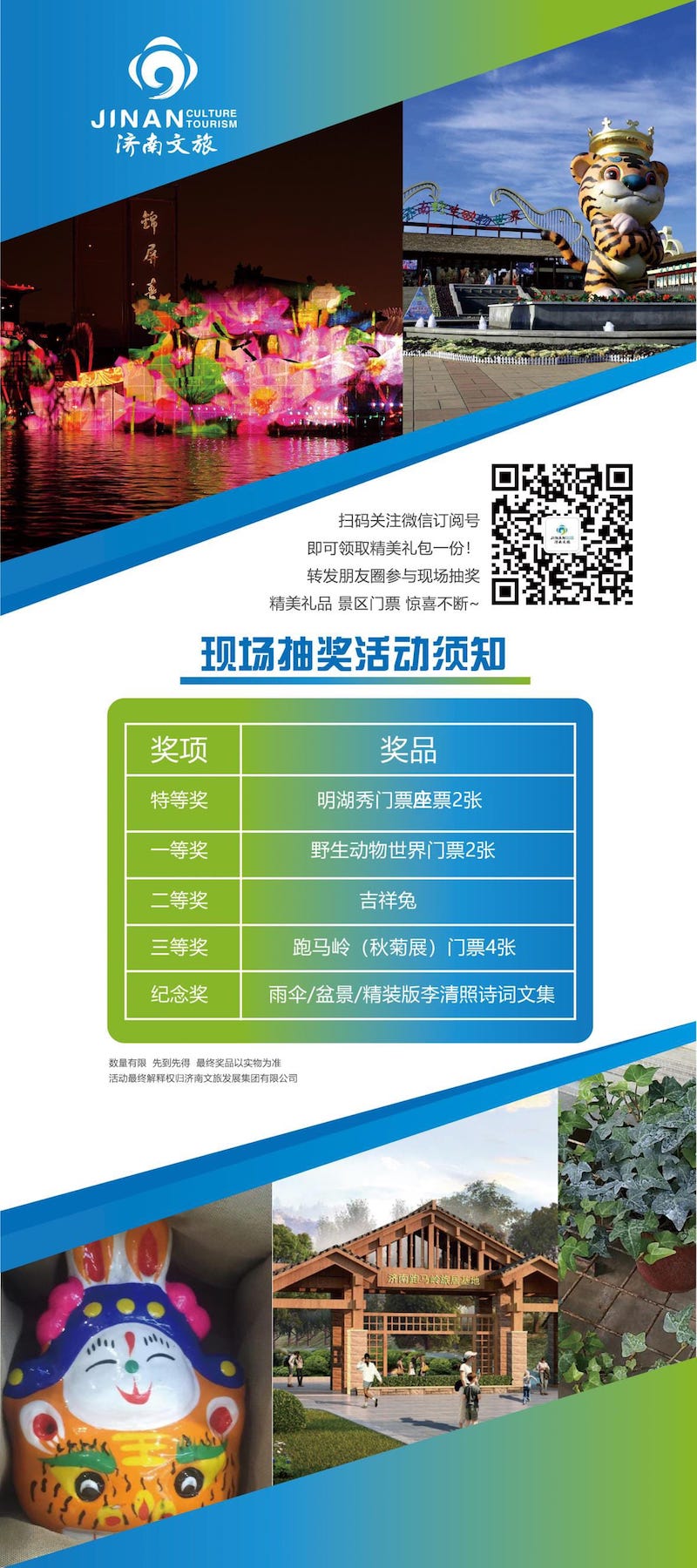 展會(huì)現(xiàn)場(chǎng)的抽獎(jiǎng)活動(dòng)最是誘人,通過掃描集團(tuán)訂閱號(hào)二維碼即可領(lǐng)取精美禮包一份,轉(zhuǎn)發(fā)朋友圈,參與現(xiàn)場(chǎng)抽獎(jiǎng)活動(dòng),獎(jiǎng)品有明湖秀觀演坐票、濟(jì)南野生動(dòng)物世界門票、吉祥兔、跑馬嶺(秋菊展)門票、定制雨傘、盆景、精裝版李清照詩詞文集等,好禮多多,等您來!