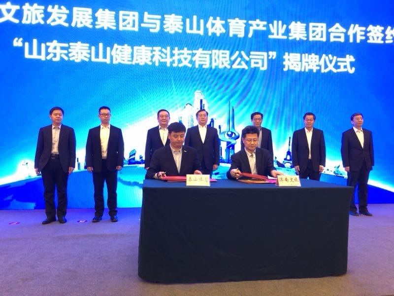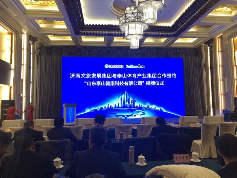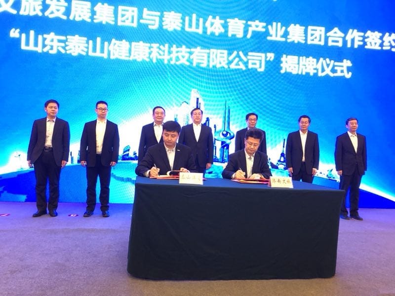2019年1月1日,新年的第一天,濟(jì)南文旅集團(tuán)與泰山體育集團(tuán)戰(zhàn)略合作簽約暨“山東泰山健康科技有限公司”揭牌活動(dòng)在舜耕山莊隆重舉行。省委常委、濟(jì)南市委書記王忠林,省體育局局長(zhǎng)李政,市委常委、秘書長(zhǎng)蔣曉光,副市長(zhǎng)王桂英,副市長(zhǎng)孫斌參加活動(dòng)。