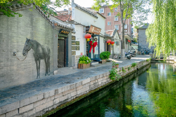 街道一邊是青磚紅瓦的老式建筑,一邊是清澈見(jiàn)底的泉水,街上隨處可見(jiàn)文藝小館、商鋪和人家,白墻灰瓦的民居中不時(shí)傳來(lái)地道的濟(jì)南話(huà),讓人仿佛走入了江南的小橋流水人家。