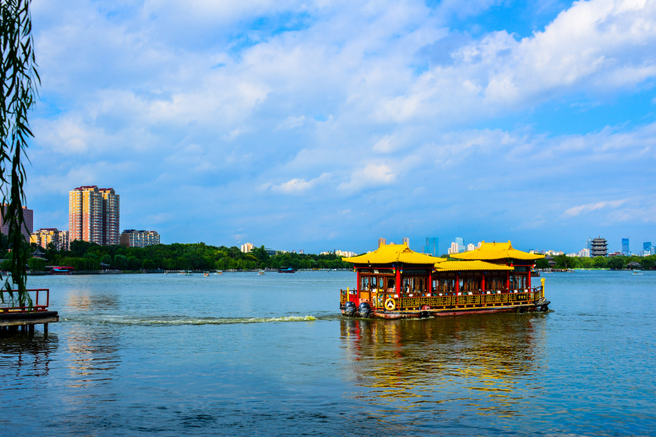 紅色的船身古樸典雅,時(shí)尚大氣,徜徉在大明湖的湖面上,秀美風(fēng)光,讓人感受到兒時(shí)“讓我們蕩起雙槳”的悠閑自在。無(wú)論是選擇觀光游覽船,還是豪華游舫,都能讓你身臨其境地感受初夏大明湖的詩(shī)情畫(huà)意。