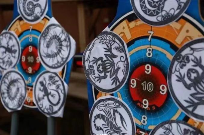 實(shí)彈射擊,參與者打中靶紙上任意一個(gè)“五毒”即可獲贈(zèng)精美子彈工藝品1個(gè);弓箭射箭,由教官帶領(lǐng)孩子進(jìn)行弓箭射五毒活動(dòng)并講授五毒文化與端午節(jié)文化由來(lái)。