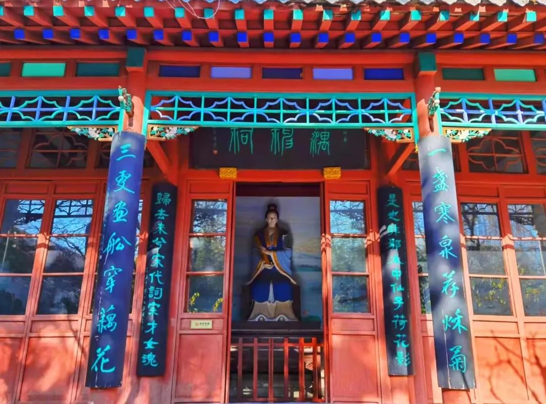 門口是濟南著名文化學者徐北文先生所作的祠聯(lián):“是耶非耶,水中仙子荷花影;歸去來兮,宋代詞宗才女魂。”由此可知,“藕神”正是“詞宗才女”李清照。