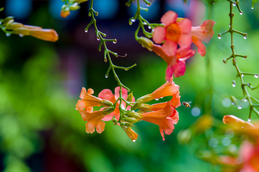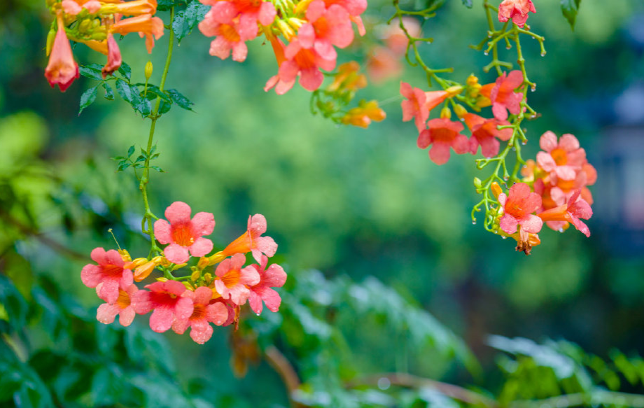 雨中的凌霄花顯得更為嬌艷