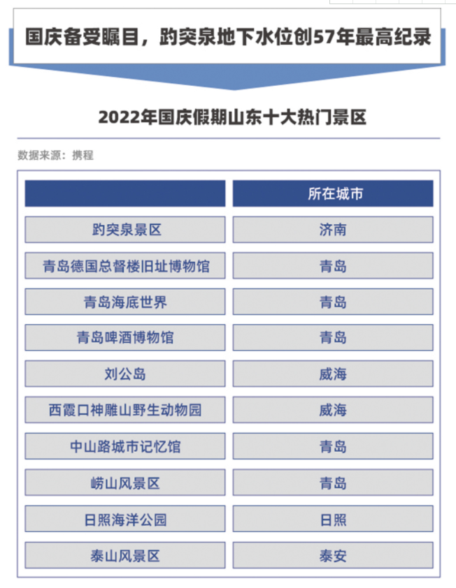 在剛剛過去的國慶假期,最受矚目的景點(diǎn)在哪里?近日,攜程發(fā)布的“2022年國慶假期山東十大熱門景區(qū)”,濟(jì)南趵突泉榮登榜首。