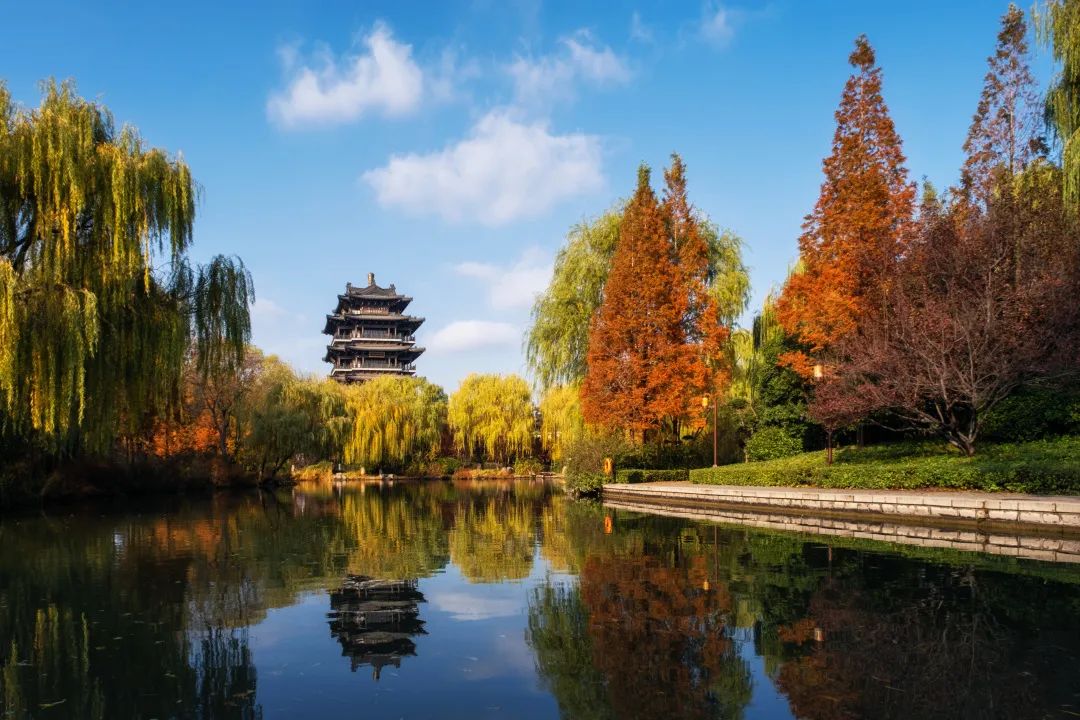 水色青青,楊柳依依,歷史悠久的濟(jì)南護(hù)城河到了秋季,河邊的綠樹開始變色,又是另一番美麗景象。