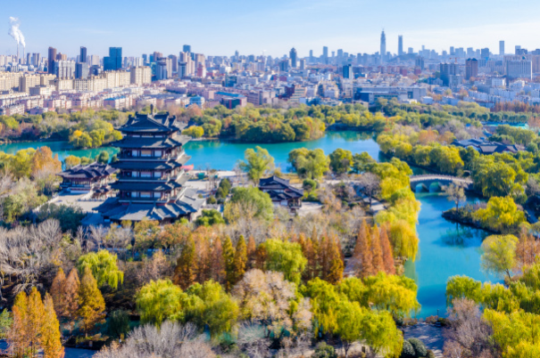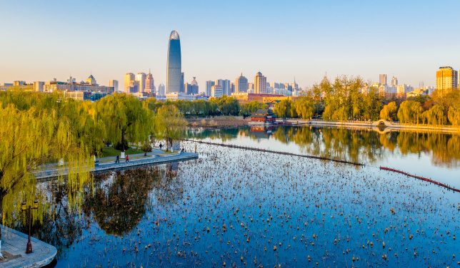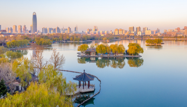 冬日,大明湖兩岸挺拔的樹已經(jīng)泛黃,從上空看去,日光灑在湖面上波光粼粼。