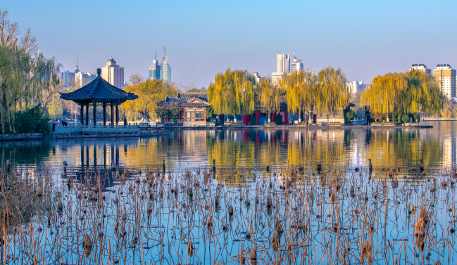 冬天的大明湖,有著獨(dú)特的園林景觀。在夏天碧葉接天、紅花映日的荷花,到了數(shù)九寒天之際仍體現(xiàn)出不同的園林之美。