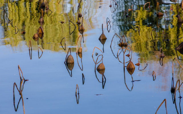 荷桿有的筆直,有的彎曲,或折成幾段,與水中的倒影組成幾何圖案,變化萬(wàn)千。雖然芬芳吐盡,卻帶有韻味。在陽(yáng)光的映照下,呈現(xiàn)出耀耀生輝的金黃色澤。