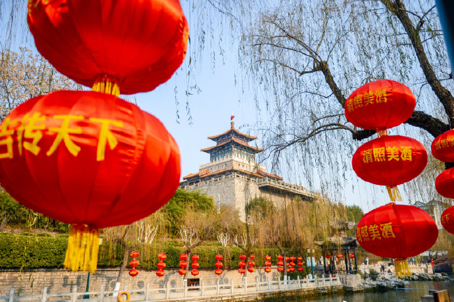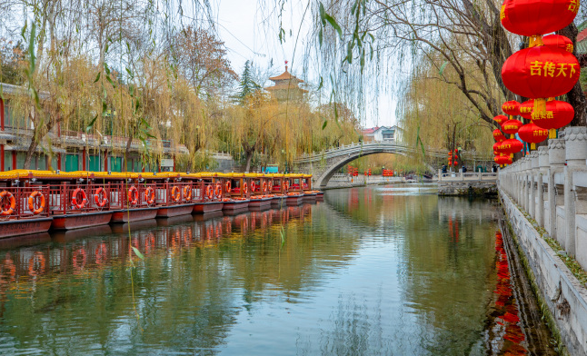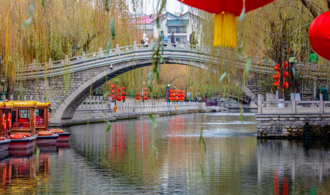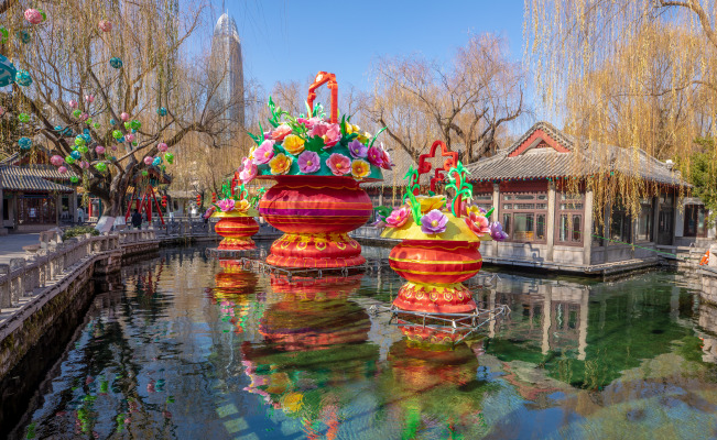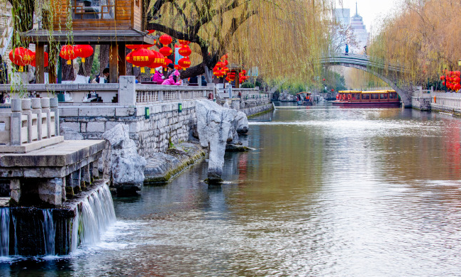 大紅燈籠掛滿河邊,和碧藍的河水構成最美的泉水景觀,營造出紅火的節(jié)日氣氛。尤其是當夜幕降臨,泉水、彩燈、燈籠交相輝映,把景區(qū)裝點得五彩斑斕。