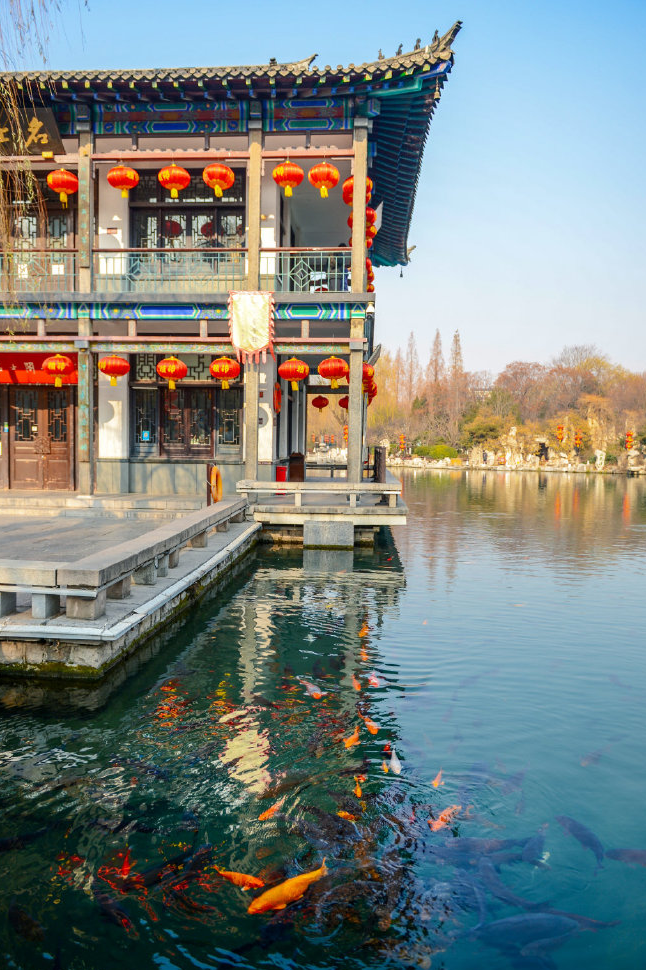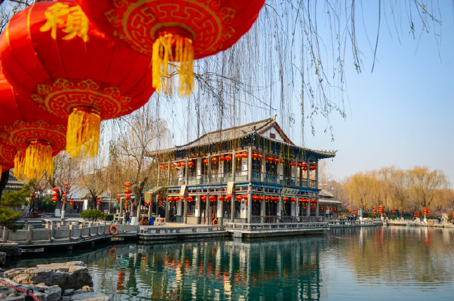 冬日里的濟南五龍?zhí)毒皡^(qū),顏色依舊豐富多彩,游客們趁著冬日暖陽在這里賞景游玩,一串串大紅燈籠高高掛,給略顯冷清的公園增添了吉祥喜慶的色彩,也為即將到來的新年帶來了濃濃的暖意。