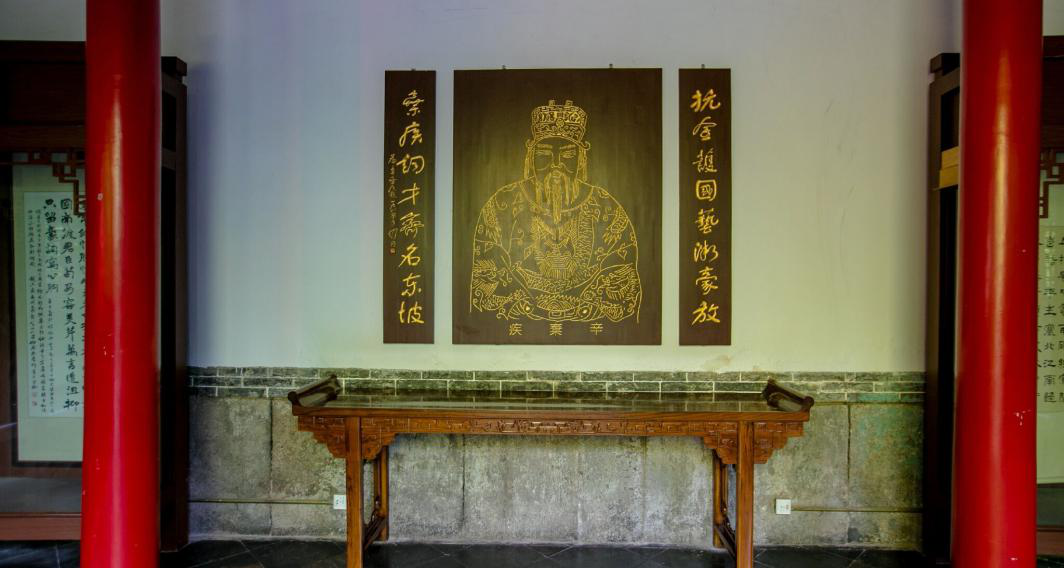 辛稼軒紀(jì)念祠位于大明湖景區(qū)西南岸,坐北朝南,現(xiàn)有兩進(jìn)院落,東西兩個跨院。東跨院二進(jìn)院正北大廳是“辛棄疾紀(jì)念堂”,大廳迎門處是辛棄疾的銅像,銅像背面墻壁是木刻的當(dāng)代書法家魏啟后手書的辛詞代表作——《破陣子•為陳同甫賦壯詞以寄之》,兩邊展櫥內(nèi)懸掛有辛棄疾生平事跡展、年譜、行跡示意圖等。西跨院“停云堂”迎門是辛棄疾的線描木刻像,對聯(lián)為集字聯(lián)“抗金護(hù)國藝術(shù)豪放 棄疾詞才齊名東坡”;東西側(cè)的展櫥內(nèi)陳列著當(dāng)代書畫家詠贊辛棄疾的書畫作品。