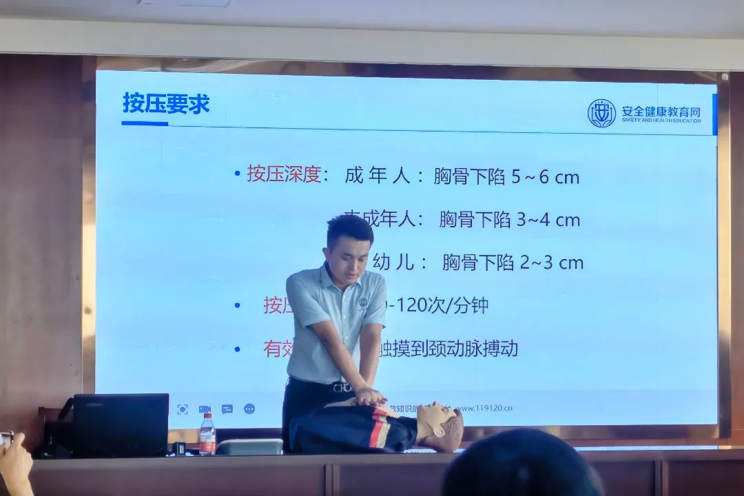 授課期間,健康教育專家通過課件的形式圍繞著職業(yè)健康知識普及如何實施職業(yè)健康保護、如何預(yù)防心腦血管疾病等方面的內(nèi)容進行了深入淺出的講解。同時,為了進一步提高培訓(xùn)效果,使大家真正掌握實操的處置能力,在完成授課內(nèi)容后,又組織安排實施了心肺復(fù)蘇胸外按壓應(yīng)急救護模擬練習(xí),大家按照講解的操作流程,積極參與演練,在專家的指導(dǎo)下,大家操作規(guī)范,方法得當(dāng),模擬練習(xí)取得圓滿成功。