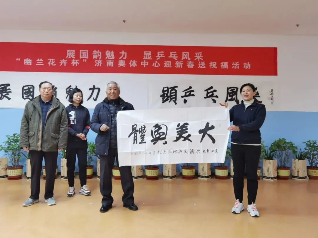 為喜迎2022年新春佳節(jié),感恩回饋廣大會員在奧體中心鍛煉健身,進一步加強健身會員交流溝通,提高健身水平,活躍健身氛圍,更好地滿足市民日益增長的高品質(zhì)健身需求,1月21日,以“展國韻魅力,顯乒乓風采”為主題的濟南奧體中心乒乓球會員迎新春、送祝?;顒釉趭W體中心體育館乒乓球室舉行。山東省書法家協(xié)會會員、山東省書畫學會會員劉千瑞,山東省書法家協(xié)會會員、濟南市書法家協(xié)會會員王維仁,山東省蘭花協(xié)會副秘書長于春風,濟南奧體中心副主任常海萍參加活動。