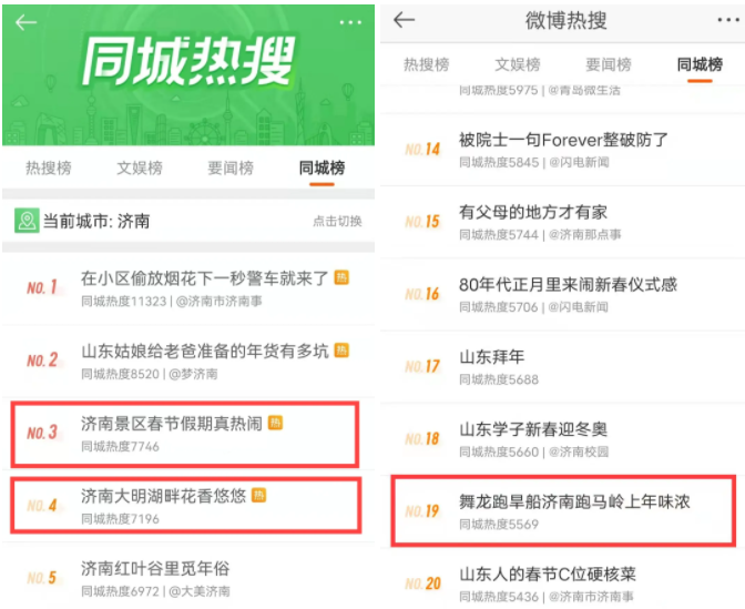 此外,春節(jié)假期期間,集團(tuán)推出的#留在濟(jì)南歡樂過年#、#大明湖畔花香悠悠#、#舞龍跑旱船濟(jì)南跑馬嶺上年味濃#、#濟(jì)南景區(qū)春節(jié)假期真熱鬧#等微博話題登錄同城話題熱搜榜,話題閱讀總量超過500萬(wàn),話題活動(dòng)廣受網(wǎng)友參與關(guān)注。