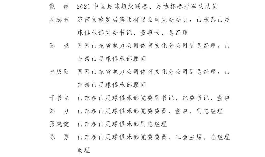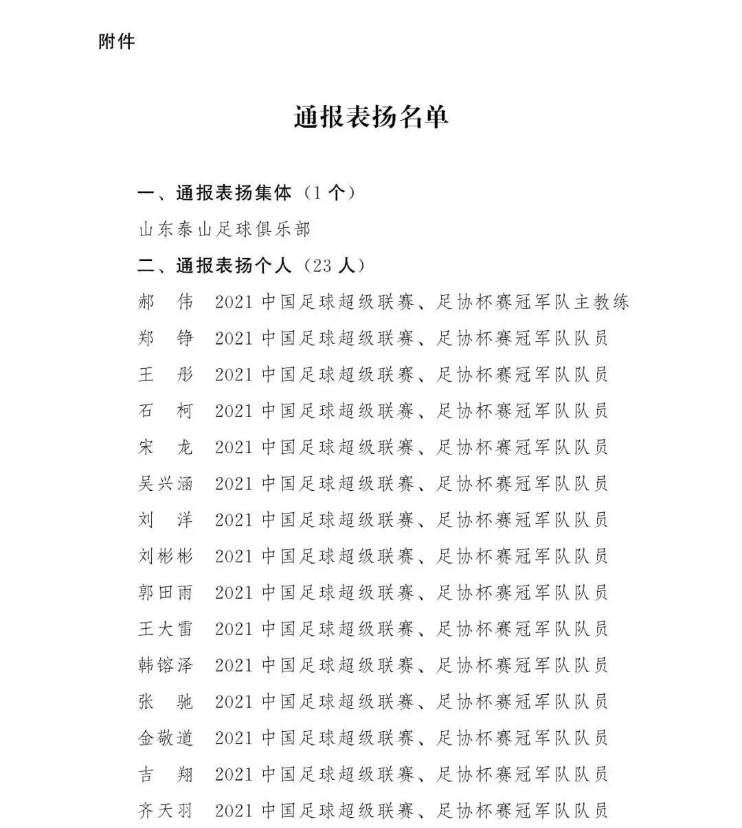 為充分發(fā)揮先進典型的示范帶動作用,大力弘揚干事創(chuàng)業(yè)、爭先創(chuàng)優(yōu)精神,省政府決定,對奪得2021賽季中超聯(lián)賽、足協(xié)杯賽“雙冠王”作出突出貢獻的山東泰山足球俱樂部和郝偉等23名個人給予通報表揚。