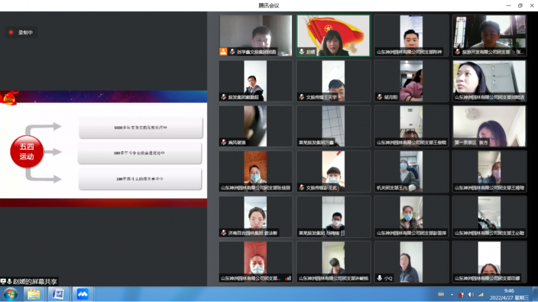 為持續(xù)深化黨的百年奮斗重大成就和歷史經(jīng)驗學習教育,引導團員青年深刻感悟新時代黨和國家事業(yè)發(fā)展的偉大成就,以實際行動迎接黨的二十大勝利召開。4月27日上午,濟南市團校聯(lián)合文旅集團團委共同舉辦“砥礪奮進守初心 青春獻禮二十大”團員教育“八個一”系列活動第一場線上培訓。活動由文旅集團團委書記劉翔宇主持,文旅集團團員干部及團員青年共計136人通過線上或線下學習等形式參加了此次培訓,集團團委近期將本次錄播課程以支部為單位分7批次推廣學習,計劃培訓集團團員青年200余人次。