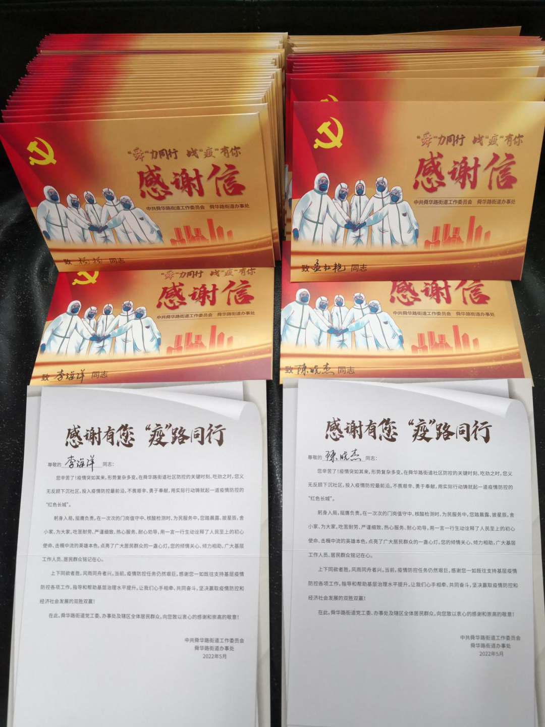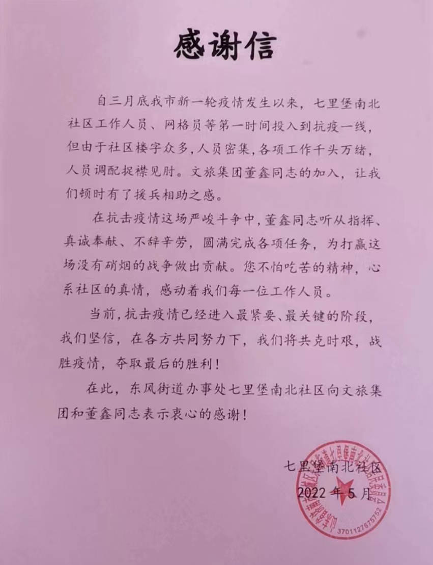 志愿者們在辛勤付出的同時,也收獲了來自下沉社區(qū)的贊揚與感謝??锷浇值例堯v國際花園社區(qū)為服務(wù)隊送來了錦旗,并專門發(fā)表題為《“文”令而動,“旅”職擔當”》的文章,東風街道七里堡南北社區(qū)送來了感謝信......這點點滴滴表達對文旅集團和會展防疫志愿服務(wù)隊工作的高度認可,必將為即將到來的會展旺季儲備提升旺盛的團隊士氣。