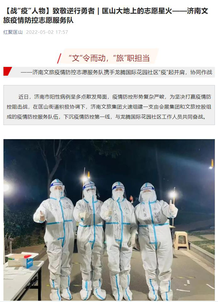 在這一場沒有硝煙的“戰(zhàn)爭”中,文旅人用自己的行動詮釋了責任和擔當,換來了城市的溫暖和安然,也獲得了屬于自己的肯定與激勵。下沉工作雖然結(jié)束了,但為人民服務(wù)不會停止。接下來,濟南文旅集團將繼續(xù)發(fā)揚沖鋒在前、團結(jié)協(xié)作、講擔當講奉獻的國企精神,為不斷推動“活力文旅”建設(shè)和文旅產(chǎn)業(yè)高質(zhì)量發(fā)展繼續(xù)奮斗!