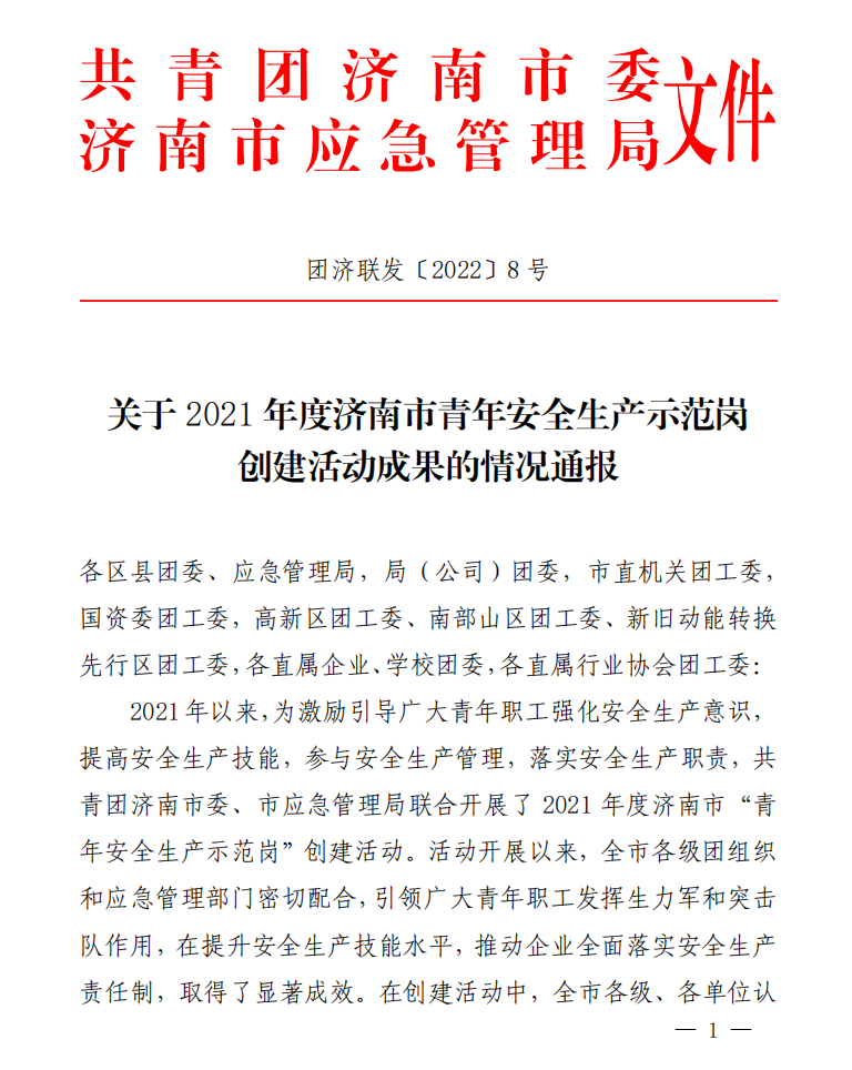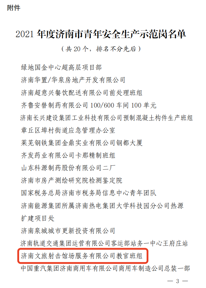 近日,共青團(tuán)濟南市委公布了《關(guān)于2021年度濟南市青年安全生產(chǎn)示范崗創(chuàng)建活動成果的情況通報》,濟南文旅射擊館場服務(wù)有限公司教官班組榮獲“濟南市青年安全生產(chǎn)示范崗”榮譽。