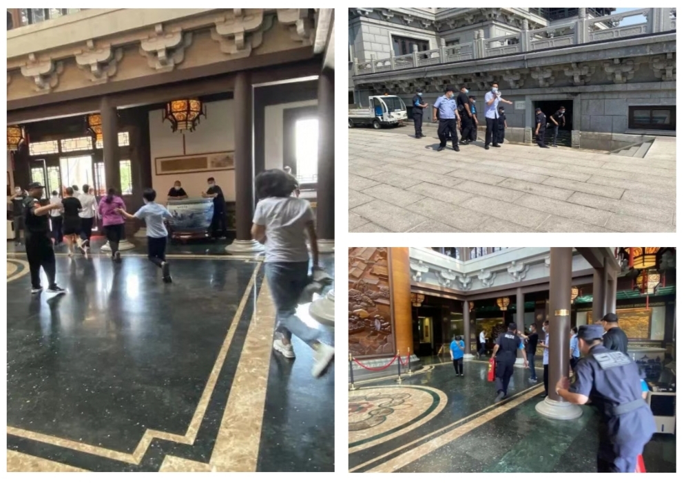 超然樓消防應(yīng)急疏散演練從實(shí)戰(zhàn)出發(fā),由超然樓班組長邢娟按照應(yīng)急預(yù)案組織班組人員(物業(yè)人員)處置控制火情、疏散游客,安??坡犃疃鴦?dòng)、火速增援,撲滅火情、警戒現(xiàn)場。整個(gè)演練過程清晰順暢、措施完善、處置得當(dāng)。