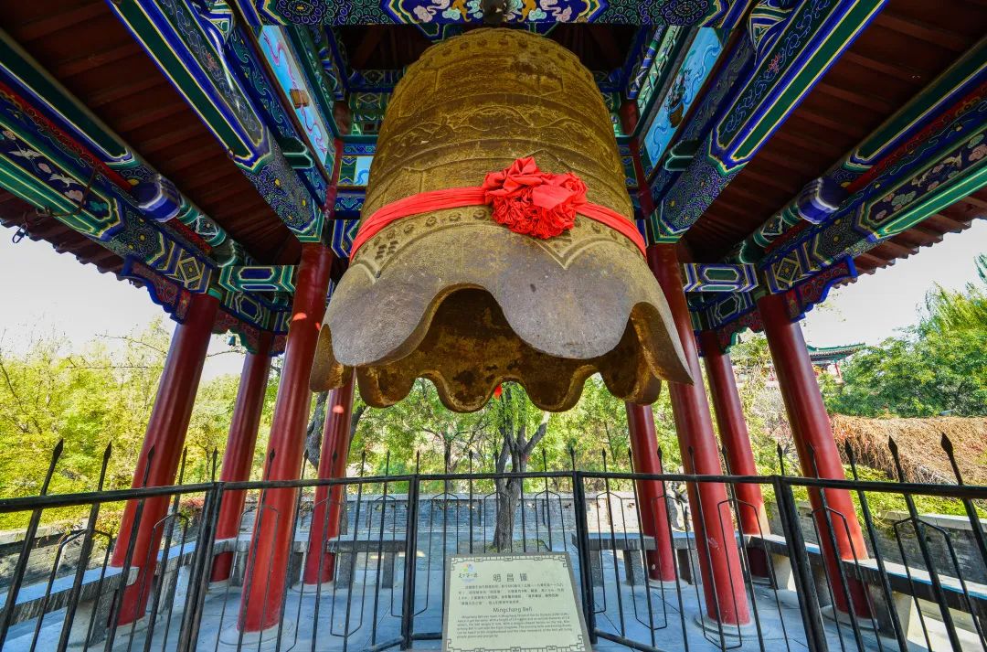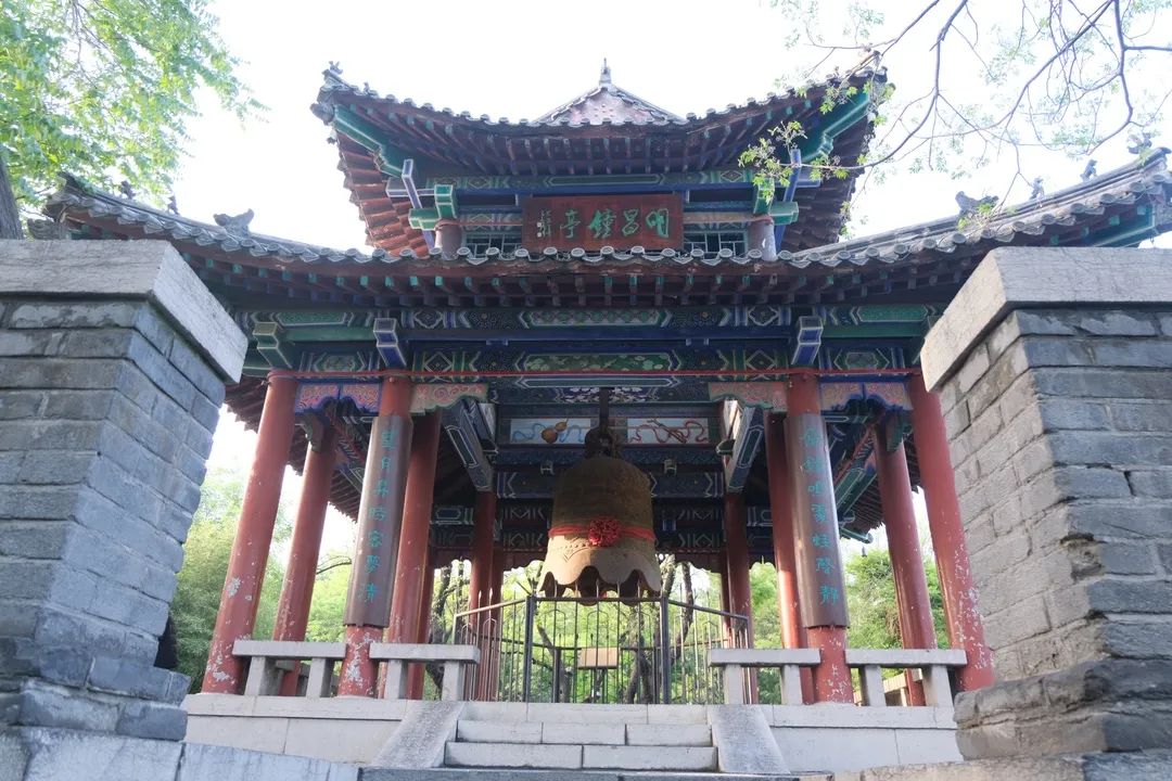 在大明湖南豐祠晏公臺(tái)上有一鐘亭,亭內(nèi)懸一古鐘。該鐘始建于金代明昌年間(公元1190-1196年),高2.3米,口徑1.7米,厚0.13米,重8000公斤,懸掛于6米高臺(tái)之上。