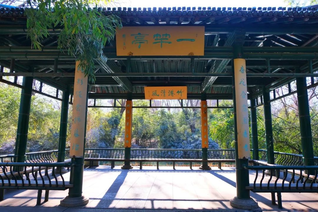 沿鵲華路南行過(guò)北渚橋十幾米,西側(cè)有一片竹林,名為“竹港清風(fēng)”。竹林南端水邊建一亭,取名“一竿亭”。
