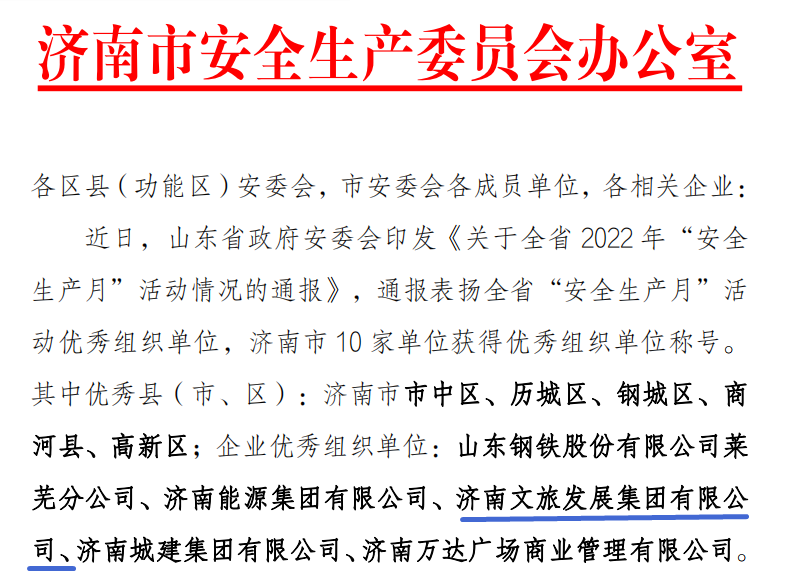 近日,省安委會下發(fā)通知,通報全省2022年“安全生產月”活動情況,并對活動優(yōu)秀組織單位進行通報表揚,濟南文旅集團榮獲全省“優(yōu)秀組織單位”稱號。