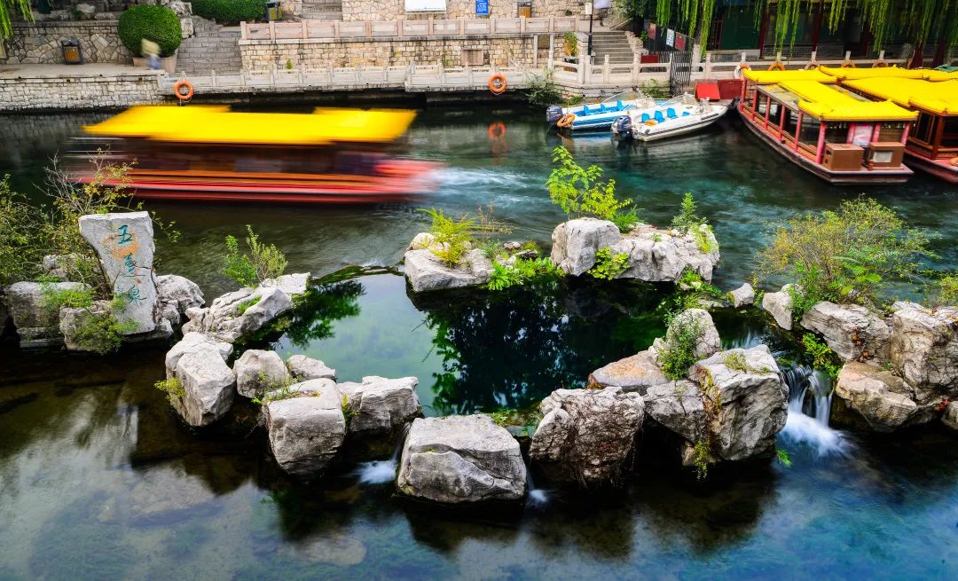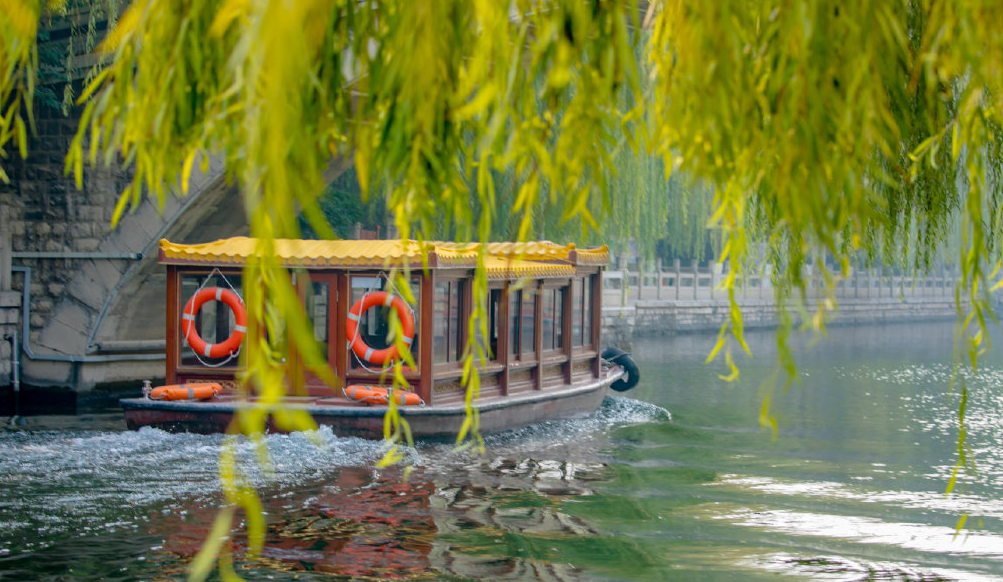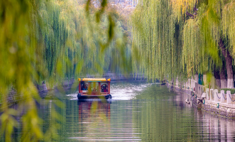 黑虎泉船站是泉水游覽景觀帶通航的首站,登上古色古香的畫(huà)舫,沿河而行,一路恍若進(jìn)入古樸的畫(huà)境。河邊的草木披上了燦爛的色彩,與清澈的河水相映成趣。
