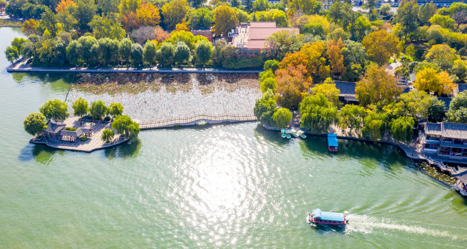 秋光大好,藍(lán)天白云和水面相互映襯顯得湖水和泉水愈發(fā)碧綠。沿著護(hù)城河游濟(jì)南,乘畫(huà)舫游船賞秋色,你會(huì)看到不一樣的風(fēng)光,聽(tīng)到不一樣的韻律,收獲不一樣的感動(dòng)。