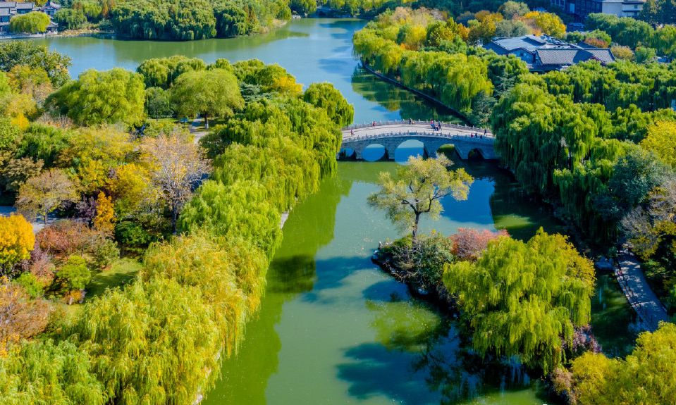 畫(huà)舫經(jīng)過(guò)五龍?zhí)洞l,穿過(guò)煙波橋,進(jìn)入大明湖。水面陡然開(kāi)闊,沿湖八百余株垂柳環(huán)繞,垂柳穿上了泛黃色的衣裳,殘荷在秋風(fēng)里與垂柳爭(zhēng)寵,把秋日的大明湖裝扮地異常優(yōu)雅自如。