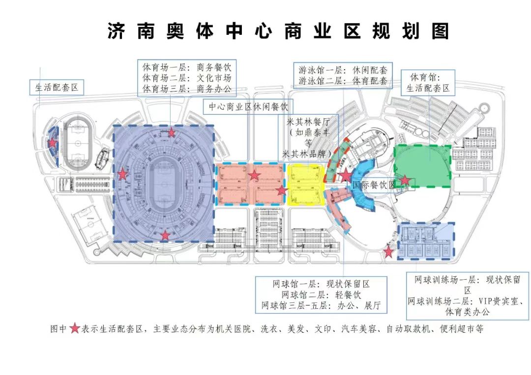 體育場(chǎng)一層規(guī)劃為商務(wù)餐飲區(qū),待招商鋪100-2000㎡約9家;