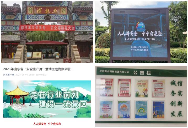3. 開展廣泛宣傳。各單位結(jié)合實(shí)際,多形式、多角度進(jìn)行宣傳。第一泉景區(qū)利用微信公眾號轉(zhuǎn)發(fā)山東省“安全生產(chǎn)月”宣傳海報,在趵突泉、五龍?zhí)?、大明湖等人流密集區(qū)域懸掛宣傳橫幅22條。旅開公司、濟(jì)南野生動物世界、產(chǎn)業(yè)運(yùn)營公司等利用大屏幕持續(xù)滾動播放安全知識和宣傳標(biāo)語,通過懸掛條幅、制作宣傳海報等方式對安全生產(chǎn)月活動進(jìn)行大力宣傳。同時,百合園林、萊蕪城投在辦公區(qū)域宣傳欄、樓道等醒目位置張貼“安全生產(chǎn)月”活動主題標(biāo)語或宣傳畫,營造全員關(guān)心安全生產(chǎn)、參與安全發(fā)展的濃厚輿論氛圍。
