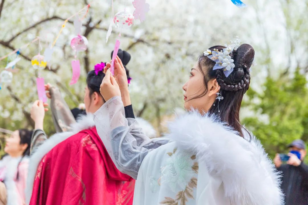 櫻花節(jié)期間將推出櫻花文化風情展和特色演藝互動活動,每周六周日組織漢服巡游。微風拂過,泉水映襯,五龍?zhí)豆珗@櫻花林內的清香沁入心脾,透過陽光,有花瓣飄落,身著華服的小姐姐們在樹下經過,仿佛穿越千年,又似人間仙境。同時,五龍?zhí)豆珗@東門小廣場特設了“櫻雨心愿”活動區(qū)。市民游客可將心愿寫在愿望卡上,懸掛于櫻花樹下。