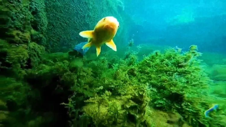 在這清澈瓦藍的泉池中,多彩的魚兒們似一束束彩帶輕飛曼舞,又像一道道彩虹靈光閃動,賞心悅目,情趣橫生。