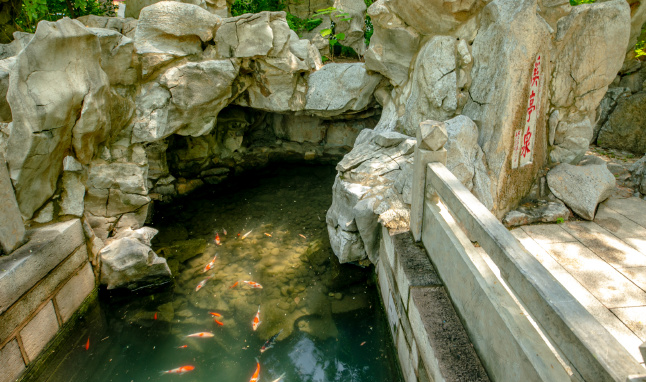 園內(nèi)的名士閣東側懸掛匾額“龍?zhí)队^魚”,匾額下,是公園最大的泉池五龍?zhí)?,這里是賞魚的主景點。潭中五彩錦鯉無數(shù),成群戲逐,吸引眾多游人于潭邊喂魚、賞魚,更與周邊幽靜清雅的環(huán)境相映成趣,令人心曠神怡、流連忘返,是濟南著名景觀之一。