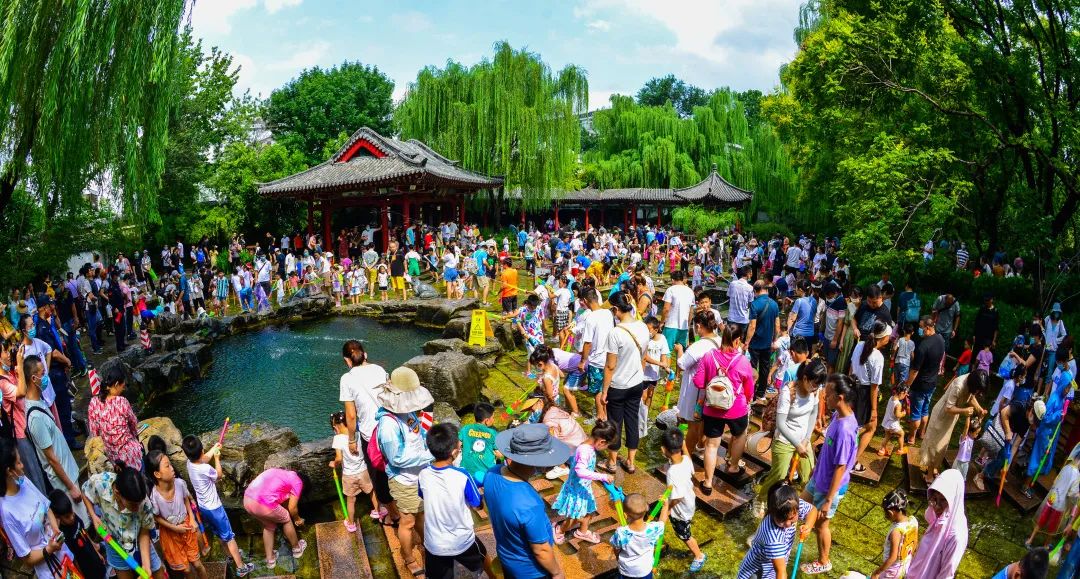 上千處泉眼汩汩流淌,尋泉、親泉、戲泉是夏天濟南人特有的消暑方式。五龍?zhí)豆珗@是最受濟南人歡迎的戲水寶地之一,綠樹濃蔭下,18℃的泉水流淌在青石上,大人孩子們踩進(jìn)清泉之中呲水槍、打水戰(zhàn),水花飛濺,歡笑聲一片。