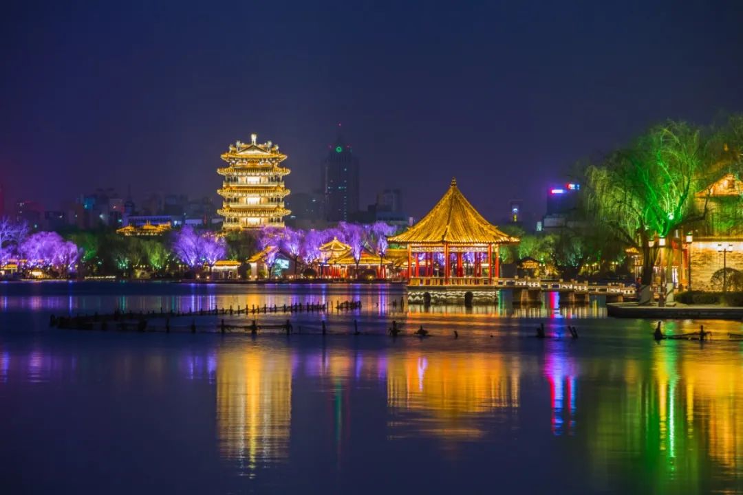 夜晚的天下第一泉景區(qū)在各色霓虹燈的點綴下,如夢如幻,乘船至大明湖,置身湖中,觀明湖夜宴,品濟南府船宴。身旁流光溢彩的拱橋、古亭倒映在湖面上,如穿越時空一般,切身感受泉水的靈動和光影的流轉(zhuǎn)。
