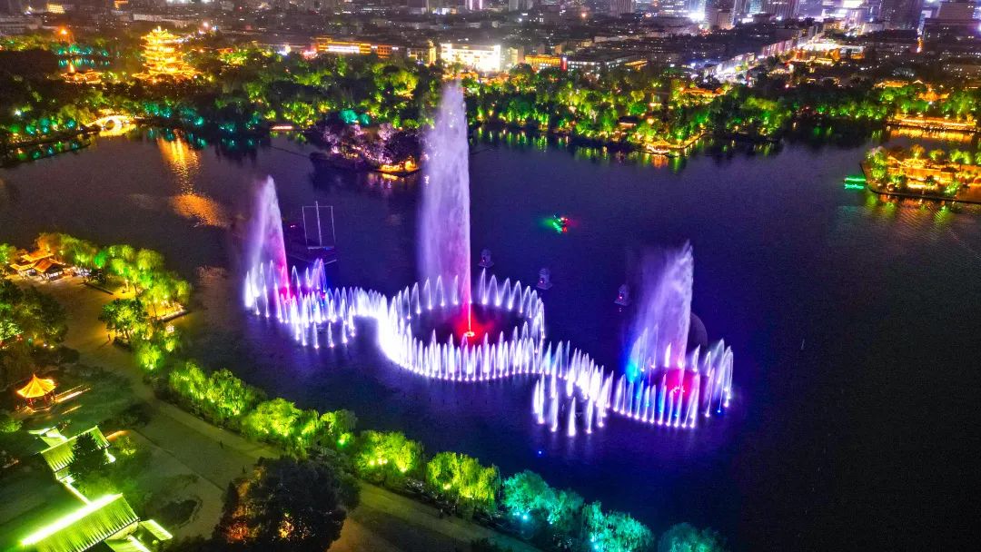 來大明湖,怎么能錯過一場泉城夜宴·明湖秀,絢麗多彩的燈光和美景,從波光粼粼的湖面上奔涌而出,噴泉、月屏、浮臺在夜色中交相輝映,一幕幕場景隨著音樂起舞。