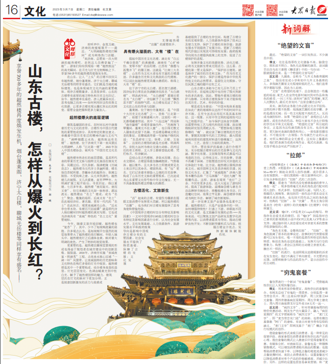 3月7日,大眾日報刊發(fā)《山東古樓,怎樣從爆火到長紅?》的文章,文章以大明湖超然樓爆火為例,探討山東古樓,怎樣從爆火到長紅?內(nèi)容中寫到:歡呼聲中,金筑玉砌,濟南的夜緩緩展開……最近,“大明湖超然樓亮燈瞬間”成為網(wǎng)絡熱門話題,“來濟南,總要來一次大明湖的超然樓吧,走到這兒仿佛穿越了一般”。游客們紛紛到現(xiàn)場一睹“超然致遠”的高光瞬間,在月光與燈光交相輝映之下,享譽700多年的超然樓再度煥發(fā)生機。