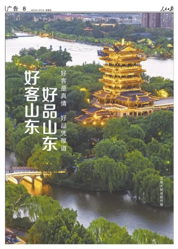 3月9日,《人民日報》第8版整版以濟南大明湖超然樓為背景,推介“好客山東 好品山東”。這也是今年全國兩會期間,《人民日報》第3次整版推介,突出“好客是真情 好品憑厚道”的品牌形象。