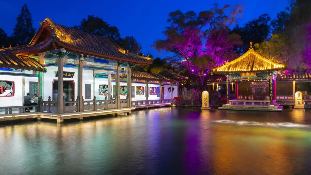 為了給市民游客提供更好的體驗(yàn)感,趵突泉公園等方面也在不斷探索泉水夜游新玩法。濟(jì)南文旅集團(tuán)旅游開發(fā)公司營銷部部長宋海鵬介紹,公園內(nèi)的皇華軒、望鶴亭、濼湄樓、濼苑、皇華苑、北門服務(wù)部營業(yè)時(shí)間同步延時(shí),游客夜晚入園后,除了可以打卡流光溢彩的“三股水”,還可以走進(jìn)泉畔的望鶴亭茶社品茗聽泉,或者嘗一嘗趵突泉文創(chuàng)雪糕、感受一下濟(jì)南民俗文化,“護(hù)城河游船項(xiàng)目以趵突泉景區(qū)為核心,推出了趵突泉-解放閣、趵突泉-超然樓兩條新路線,游客在夜探‘趵突騰空’勝景后,可以從趵突泉北游船碼頭登船,前往解放閣或者超然樓繼續(xù)游玩”。