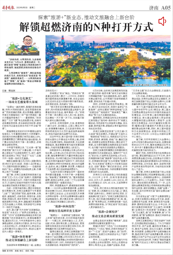 2023年9月5日,《齊魯晚報(bào)》刊文《探索“旅游+”新業(yè)態(tài),推動(dòng)文旅融合上新臺(tái)階 解鎖超燃濟(jì)南的N種打開方式》。對(duì)濟(jì)南文旅集團(tuán)做實(shí)產(chǎn)業(yè)矩陣,深化文化演藝、體育賽事、休閑度假、會(huì)展經(jīng)濟(jì)等產(chǎn)業(yè)板塊融合發(fā)展,推進(jìn)濟(jì)南文旅產(chǎn)業(yè)高質(zhì)量發(fā)展進(jìn)行了詳細(xì)報(bào)道。如下為稿件詳情——