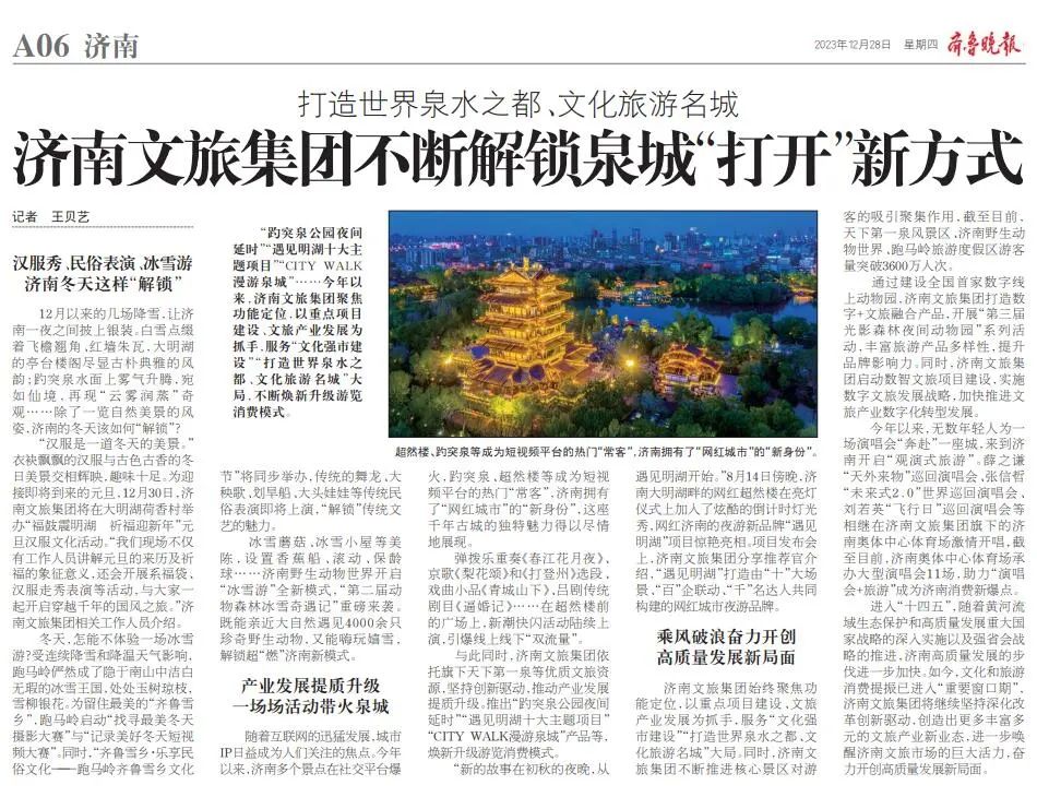 2023年12月28日,《齊魯晚報(bào)》刊發(fā)《打造世界泉水之都、文化旅游名城,濟(jì)南文旅集團(tuán)不斷解鎖泉城“打開”新方式》的文章,采寫記者為王貝藝。文章寫到,濟(jì)南文旅集團(tuán)聚焦功能定位,以重點(diǎn)項(xiàng)目建設(shè)、文旅產(chǎn)業(yè)發(fā)展為抓手,服務(wù)“文化強(qiáng)市建設(shè)”“打造世界泉水之都、文化旅游名城”大局,不斷煥新升級游覽消費(fèi)模式。如下為稿件詳情——