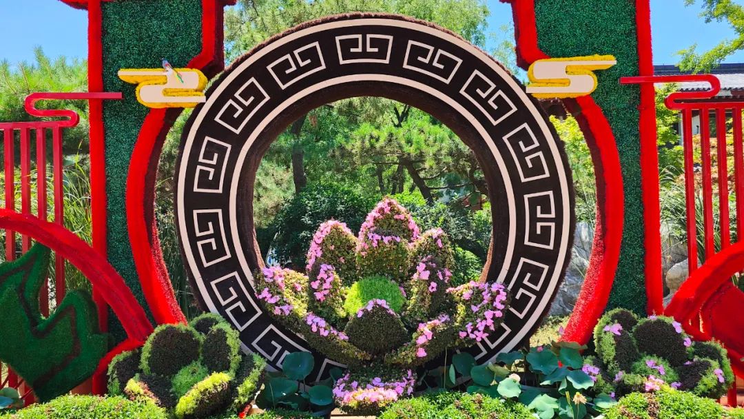 東門外廣場大型造型命名為“荷諧玫好”,由荷花、玫瑰兩種市花及扇面組成。扇面中的曲線代表著山水如畫,與蝴蝶、云彩、燈籠等吉祥要素共同組成了一幅和諧美好的畫面。鋼琴廣場品種荷花造型名為“魚躍龍門”,由中國古代神話故事激發(fā)靈感創(chuàng)作,表達(dá)了奮發(fā)向上、夢想成真、金榜題名之意。