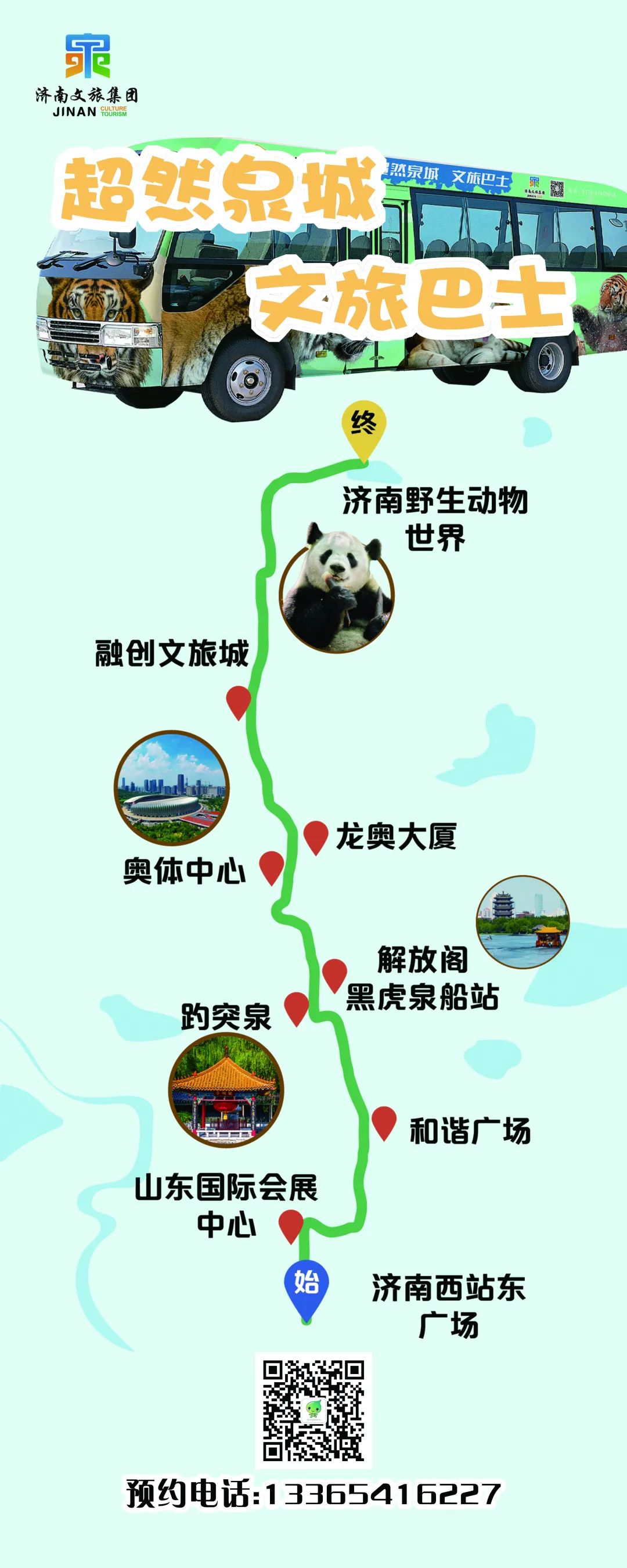 文旅巴士行車線路及站點(diǎn):濟(jì)南西站東廣場(旅服中心)—會展中心—和諧廣場—趵突泉(東門)—解放閣(黑虎泉船站)—奧體中心(西門)—龍奧大廈(南門)—融創(chuàng)文旅城(北門)—濟(jì)南野生動物世界(東門)