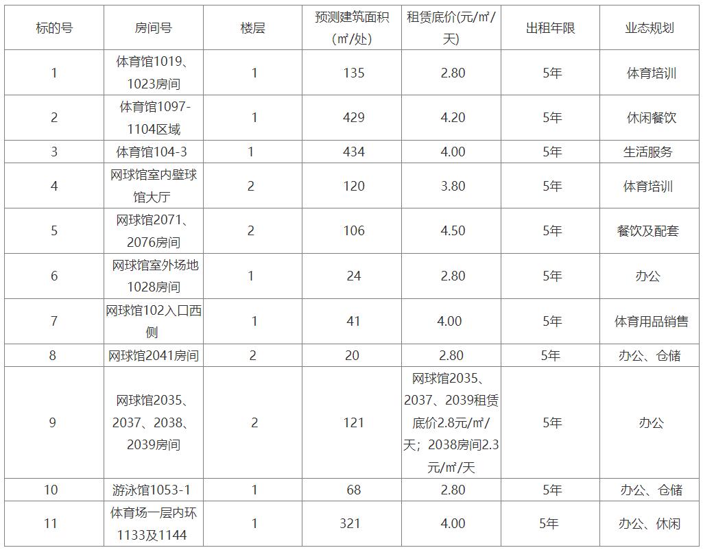 1、項(xiàng)目內(nèi)容:濟(jì)南文旅產(chǎn)業(yè)運(yùn)營管理有限公司對(duì)其所屬濟(jì)南奧體中心房產(chǎn)進(jìn)行公開招租。本項(xiàng)目共分11個(gè)標(biāo)的,可兼投兼中。擬出租的房屋位于濟(jì)南奧林匹克體育中心園區(qū)內(nèi),具體招標(biāo)內(nèi)容如下: