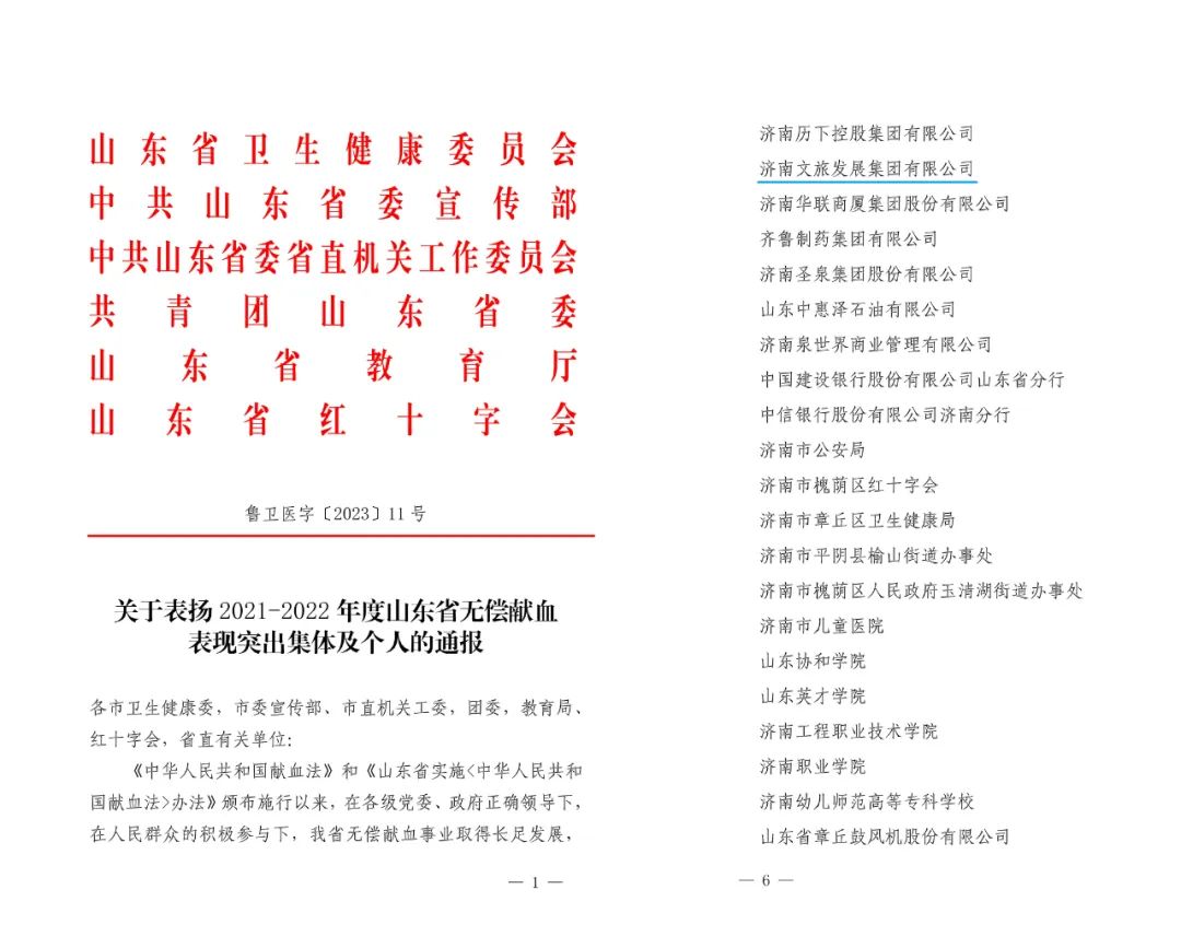 近日,山東省衛(wèi)生健康委員會(huì)、山東省委宣傳部、山東省委省直機(jī)關(guān)工作委員會(huì)、共青團(tuán)山東省委、山東省教育廳、山東省紅十字會(huì)六部委聯(lián)合發(fā)文《關(guān)于表?yè)P(yáng)2021-2022年度山東省無償獻(xiàn)血表現(xiàn)突出集體及個(gè)人的通報(bào)》,濟(jì)南文旅集團(tuán)獲“山東省無償獻(xiàn)血組織表現(xiàn)突出單位”榮譽(yù)稱號(hào)。