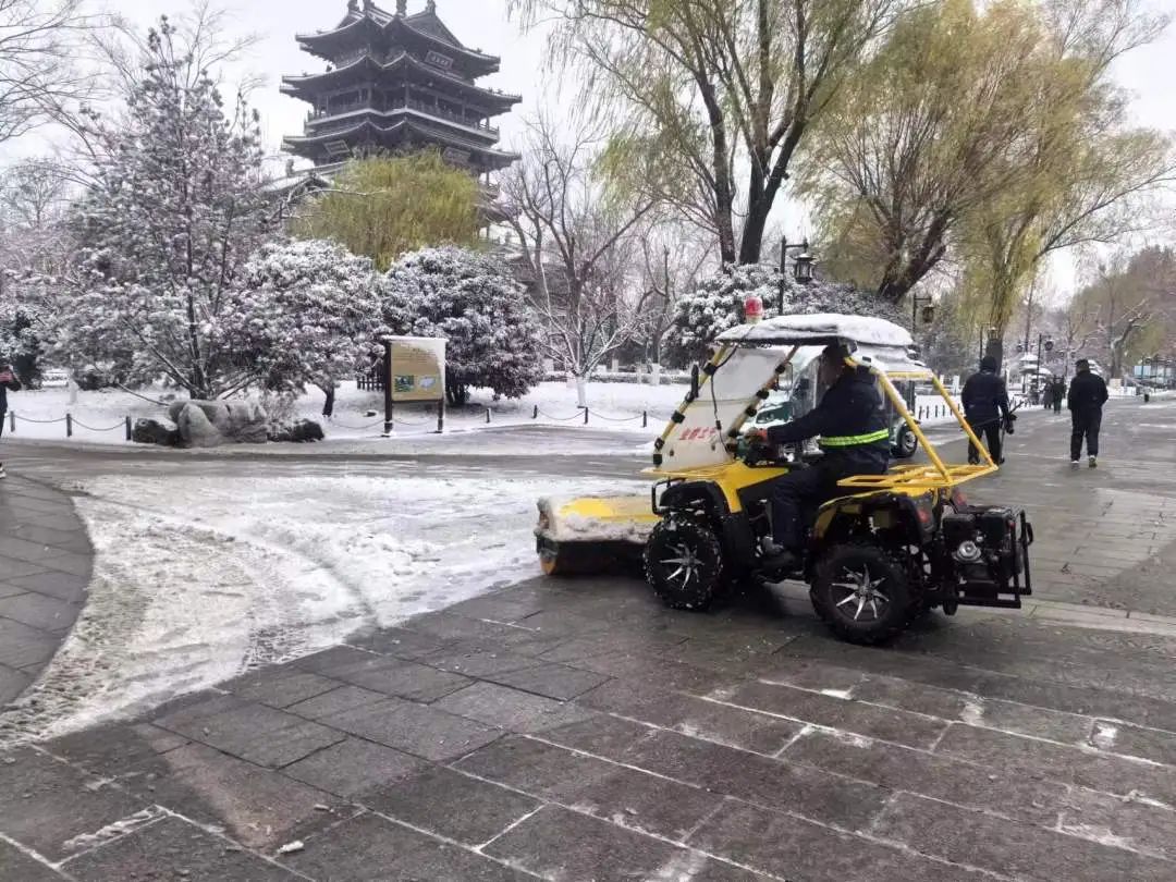 天下第一泉景區(qū)接到雪情預(yù)報(bào)后,啟動(dòng)應(yīng)急預(yù)案,夜間預(yù)留掃雪人員50余人,第一時(shí)間在園區(qū)各橋梁、出入口等處鋪設(shè)防滑材料,擺放防滑提示,設(shè)置語(yǔ)音提示。掃雪采取機(jī)械掃雪和人工清雪相結(jié)合,共投入人工200余人次,投放掃雪車2臺(tái)、改裝叉車1臺(tái)、灑水車1臺(tái)清理主干道積雪,人工清理廣場(chǎng)、橋頭積雪,使用竹桿等清理樹上積雪,真正做到雪停路清。