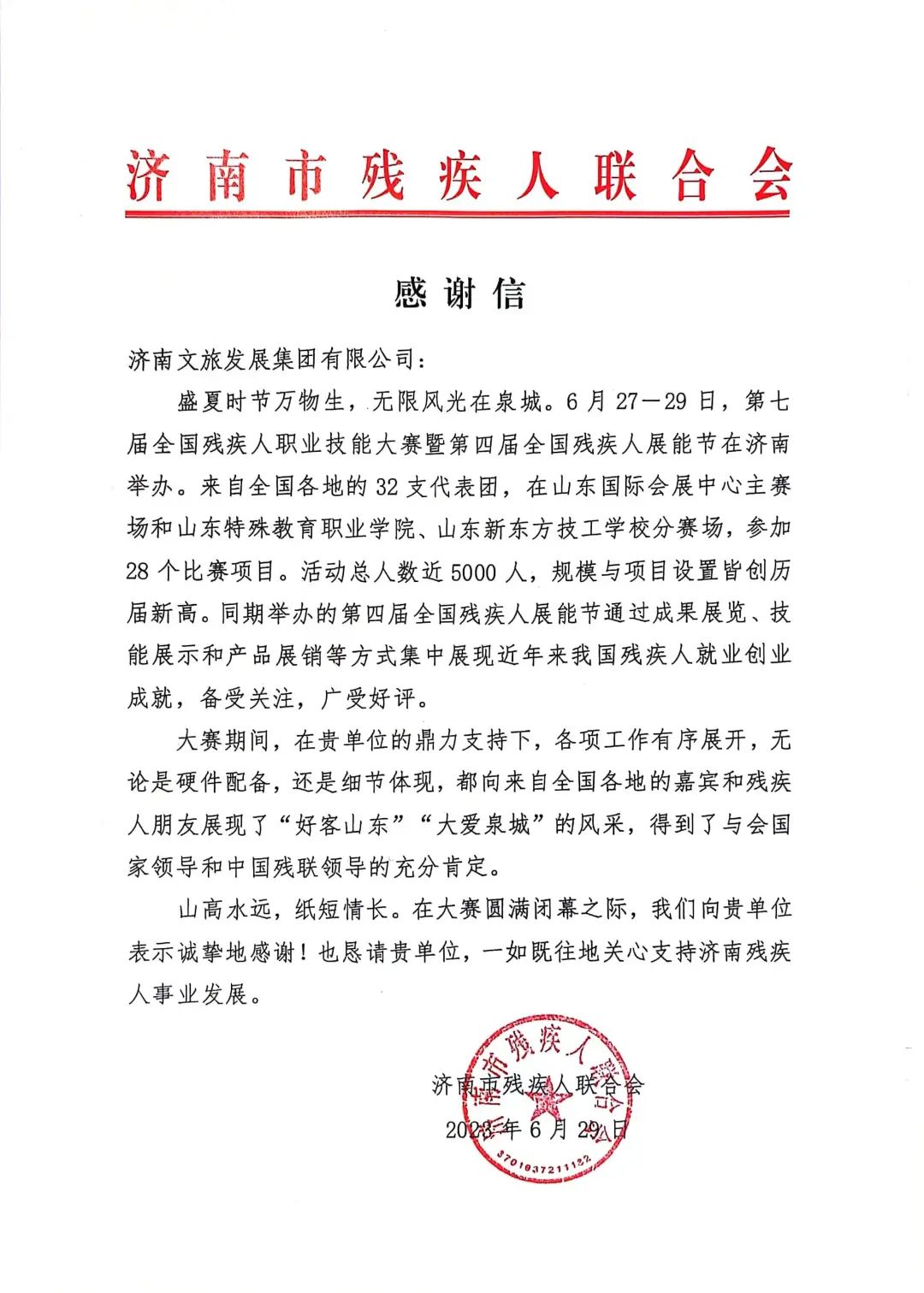 近日,濟南市殘疾人聯合會向濟南文旅集團發(fā)來感謝信,感謝信稱:6月27一29日,第七屆全國殘疾人職業(yè)技能大賽暨第四屆全國殘疾人展能節(jié)在濟南舉辦。在貴單位的鼎力支持下,各項工作有序展開,得到了與會國家領導和中國殘聯領導的充分肯定。在大賽圓滿閉幕之際,我們向貴單位表示誠摯地感謝!也懇請責單位,一如既往地關心支持濟南殘疾人事業(yè)發(fā)展。