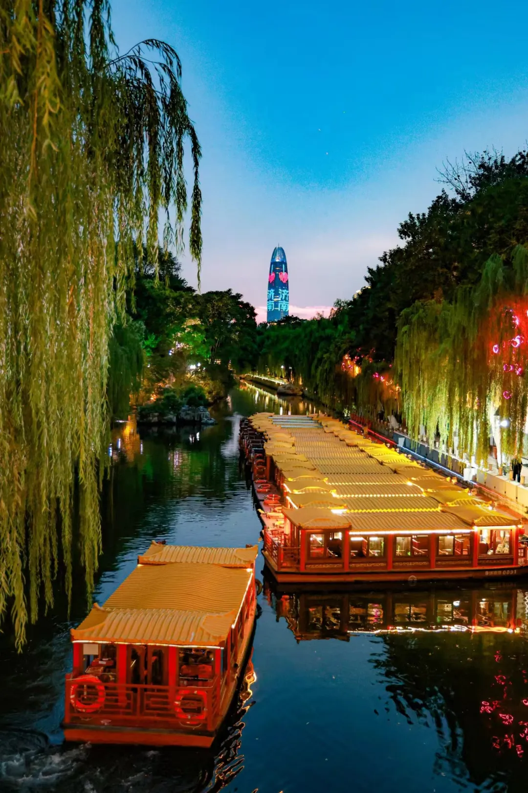 清風(fēng)朗月,夜色氤氳,不妨在護(hù)城河畔乘船一游,與名士來一場美麗的邂逅,這里淌著泉水的歷史,講述著濟(jì)南的故事。